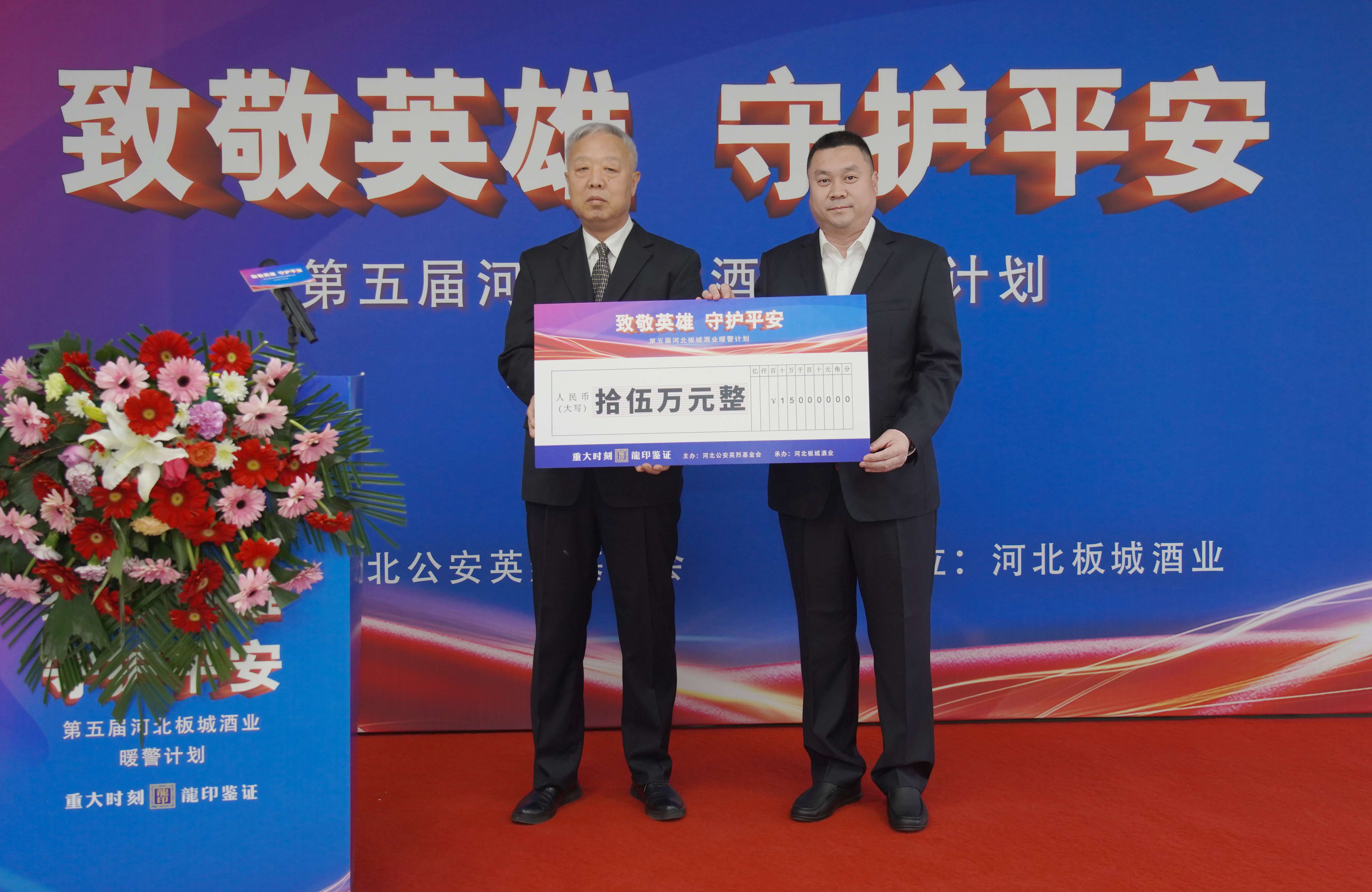 在捐贈(zèng)儀式上,板城酒業(yè)黨委書(shū)記、總經(jīng)理賀延昭向河北省公安英烈基金會(huì)捐贈(zèng)15萬(wàn)元暖警公益基金。